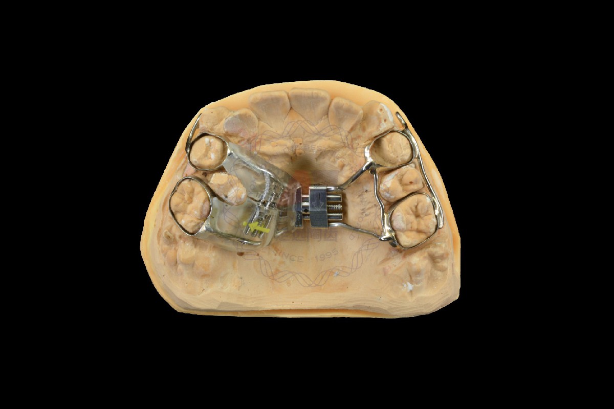 用于牙列严重拥挤或严重宽度不调的病例,腭中缝开展,使颅面生长发育正常化。附加单颗螺旋扩弓螺丝将磨牙向远中移动。